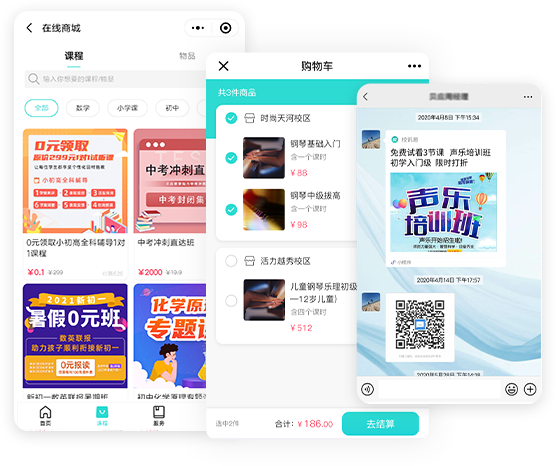 线下课程支持一键发布,自动同步到小程序商城,通过学校公众号跳转、课程链接/二维码分享等,轻松进行课程推广